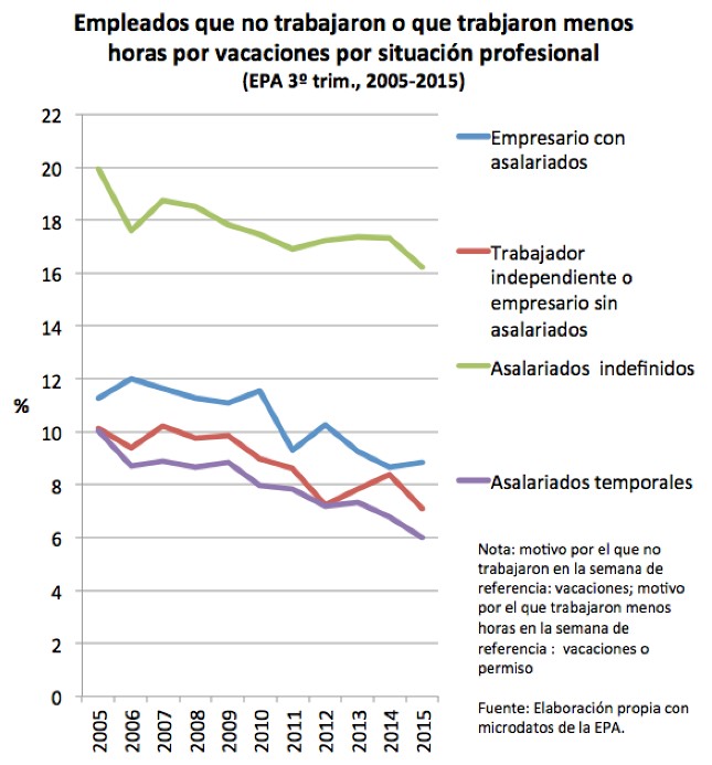 Tal y como señala el analista de Fedea, Florentino Felgueroso, el porcentaje de trabajadores que disfrutan de vacaciones estivales se ha reducido en los últimos años, coincidiendo con el estallido de la crisis, pero la principal diferencia radica en la situación profesional. Así, los empleados indefinidos que pueden cogerse vacaciones en verano casi dobla al de los empresarios, duplica al de los autónomos y supone más del doble respecto a los trabajadores temporales.