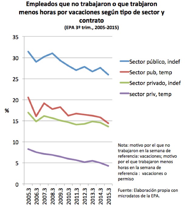Si se analiza la evolución de este indicador por sectores y por tipo de contrato, las diferencias son aún mayores: los funcionarios que disfrutan de vacaciones casi duplica a los trabajadores indefinidos del sector privado, mientras que en el caso de los temporales la diferencia entre el sector público y privado se triplica. Así pues, en materia de vacaciones estivales, “nada mejor que tener un empleo público, y nada peor que ser temporal en el sector privado”, concluye Felgueroso.