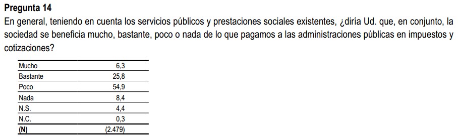 Tanto es así que más del 60% de los encuestados opina que la sociedad , en su conjunto, se beneficia más bien poco o nada del pago de impuestos dado el nivel de servicios y prestaciones existentes.