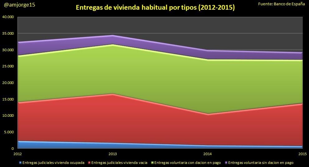 El Banco de España ha publicado los datos referentes al número de desahucios en 2015. El número total de viviendas habituales que fueron entregadas por impago de hipoteca fue de 36.929, inferior a las 38.402 de 2014 (la cifra ha sido corregida a la baja respecto a la anterior nota informativa de 2014).