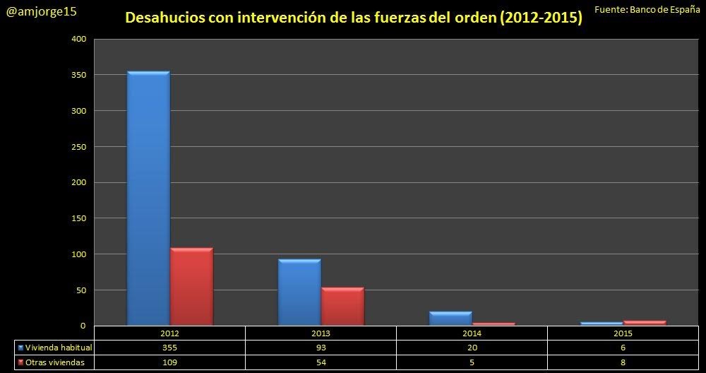 Así, en 2015, únicamente se realizaron seis intervenciones en el caso de vivienda habitual y ocho en el caso de otros inmuebles. Estos datos contrastan con las 355 intervenciones que se llevaron a cabo en 2012, pero aún así hay que destacar que en ninguno de los años el porcentaje de intervenciones policiales resultó relevante desde el punto de vista estadístico: alcanzó su nivel máximo en 2012, con el 15%, seguido del 5% en 2013, el 2% en 2014 y apenas un 0,6% en 2015. Si, además, se calculan estos mismos porcentajes sobre el total de entregas de vivienda habitual, el resultado es, simplemente, residual.