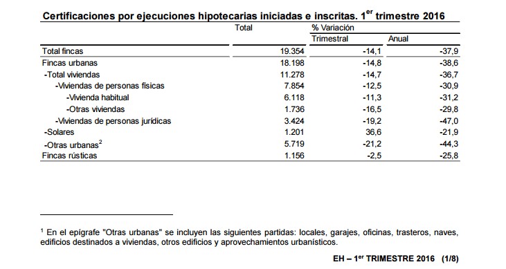 Por último, todo apunta a que el número de desahucios sigue en descenso. Según los datos disponibles del primer trimestre de 2016, las ejecuciones hipotecarias ascendieron a 6.118, un 31,2% menos un año antes.