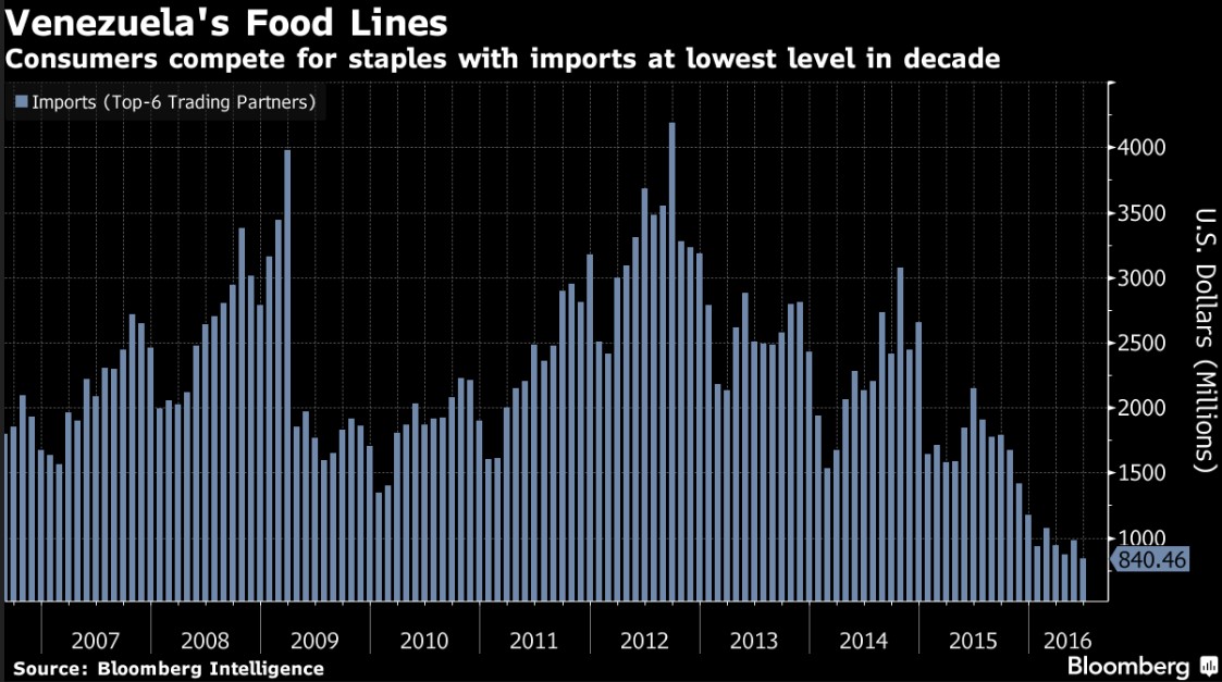 El indicador más fiable sobre la brutal escasez de alimentos son las importaciones. La expropiación masiva de empresas y tierras ha hundido el sector agroalimentario del país, con lo que depende casi exclusivamente del mercado exterior para acceder a productos básicos. Sin embargo, el rígido control cambiario, la hiperinflación que registra el país y el colapso de su economía, altamente dependiente del petróleo, está agotando sus reservas de divisas para poder sufragar las importaciones que precisa el país.