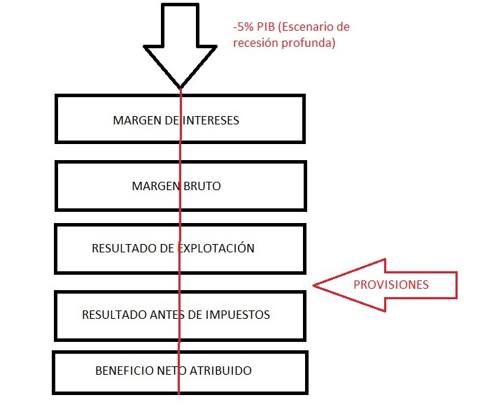 Pongamos un ejemplo. Tomando uno de los supuestos en los stress test como es una recesión severa en la economía europea (supongamos que el escenario es extremo con una caída del PIB del 5%), este ejercicio examina el impacto sobre el capital como si se tratara de un efecto lineal y de una sola vez (one-shot) sobre cada uno de los márgenes y, especialmente, sobre el resultado de explotación que es donde se contienen las provisiones y los costes.