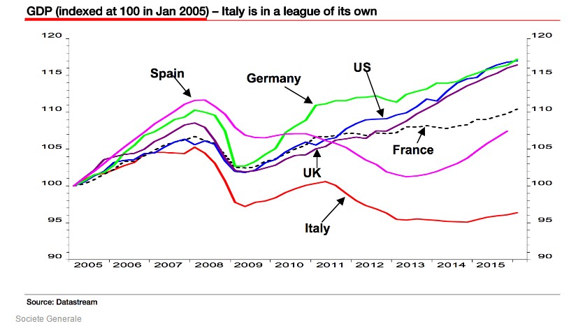 Los temores que empieza a experimentar el mercado se sustentan sobre una serie de factores a tener muy en cuenta. En primer lugar, el largo estancamiento económico que experimenta Italia desde hace años, más allá de la actual crisis. Así, a diferencia de otros países que sí han logrado salir del atolladero, el PIB italiano todavía se mantiene un 6% por debajo del nivel alcanzado en 2008 y 2009, al inicio de la crisis internacional., mientras que su tasa de desempleo aún se sitúa por encima del 11%.