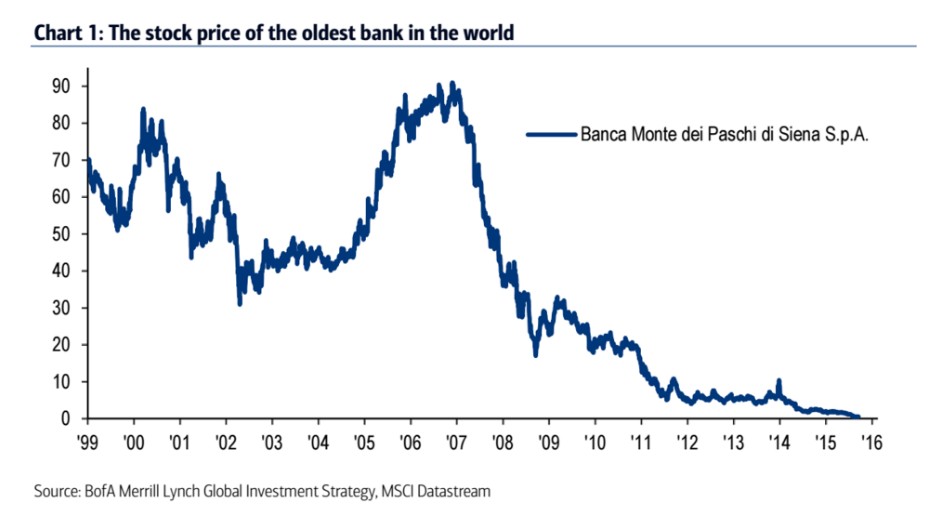 El plan de rescate diseñado para evitar la quiebra el Monte dei Paschi di Siena, el tercer banco del país y la entidad más antigua del mundo, se ha convertido en el icono de la crisis bancaria italiana, pero, en realidad, son numerosas las entidades afectadas, tal y como demuestra el desplome general que ha experimentado el sector en Bolsa.