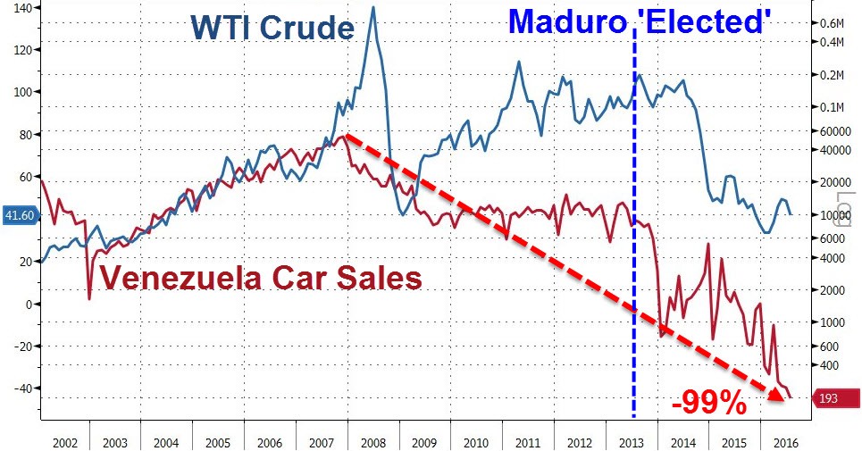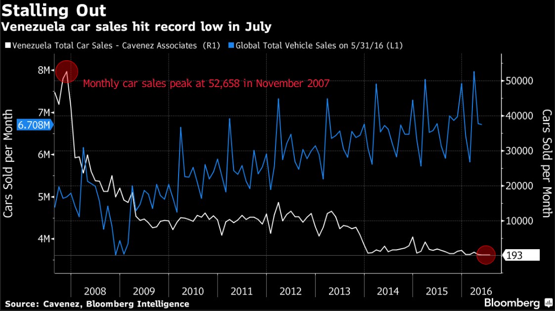Dicho volumen significa 0,6 coches por cada 100.000 personas, frente a los 475 vehículos vendidos en EEUU. La economía venezolana se enfrenta a su tercer año consecutivo de contracción, con una caída del PIB próxima al 10% este 2016, y una inflación que podría superar el 2.200% en 2017, según las últimas previsiones del Fondo Monetario Internacional (FMI). La caída del precio del petróleo ha hundido por completo una economía cuya dependencia del petróleo es casi absoluta tras más de una década de socialismo bolivariano.