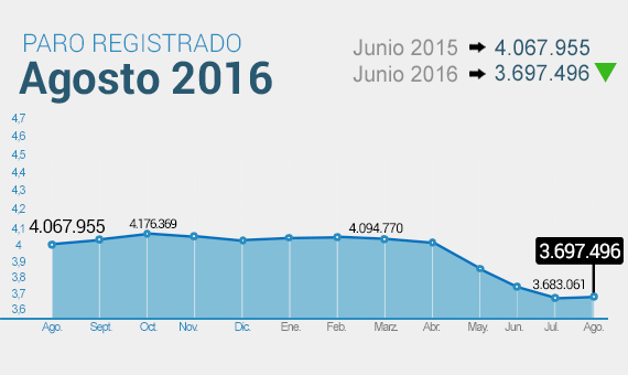 De esta forma, la cifra total de parados registrados se sitúa en 3.697.496 personas, la menor cifra registrada en un mes de agosto desde 2009, según ha informado este viernes el Ministerio de Empleo y Seguridad Social.