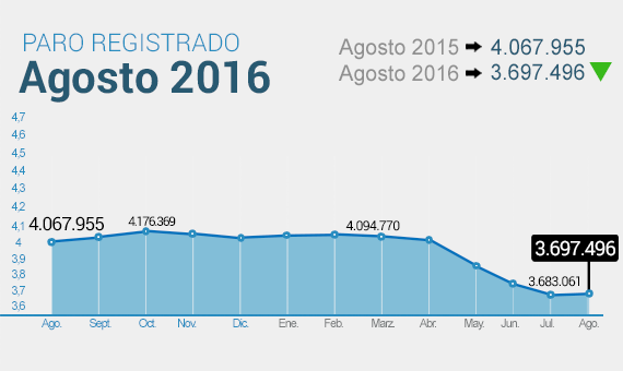 El número de parados registrados en las oficinas de los servicios públicos de empleo (antiguo Inem) subió en agosto en 14.435 personas en relación con el mes anterior, dando por concluida una sucesión de cinco meses consecutivos a la baja. De este modo, el número total de parados se sitúa en 3.697.496 personas, la menor cifra registrada en un mes de agosto desde 2009, según ha anunciado este viernes el Ministerio de Empleo.