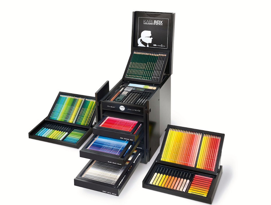 La Karlbox, que se podía adquirir a través de internet, incluye lápices de todos los colores, acuarelas y marcadores que bien podrían servir para todo el año escolar de un estudiante (si se atreve a usarlo). Gris, azul, rojo, amarillo, verde y azul con los colores que dan nombre a los 6 compartimentos en los que se divide la caja. Además, el primer cajón incluye elementos básicos como lápiz de grafito, goma de borrar , afilador y pincel, según afirman en Colour in black, la página web de venta.