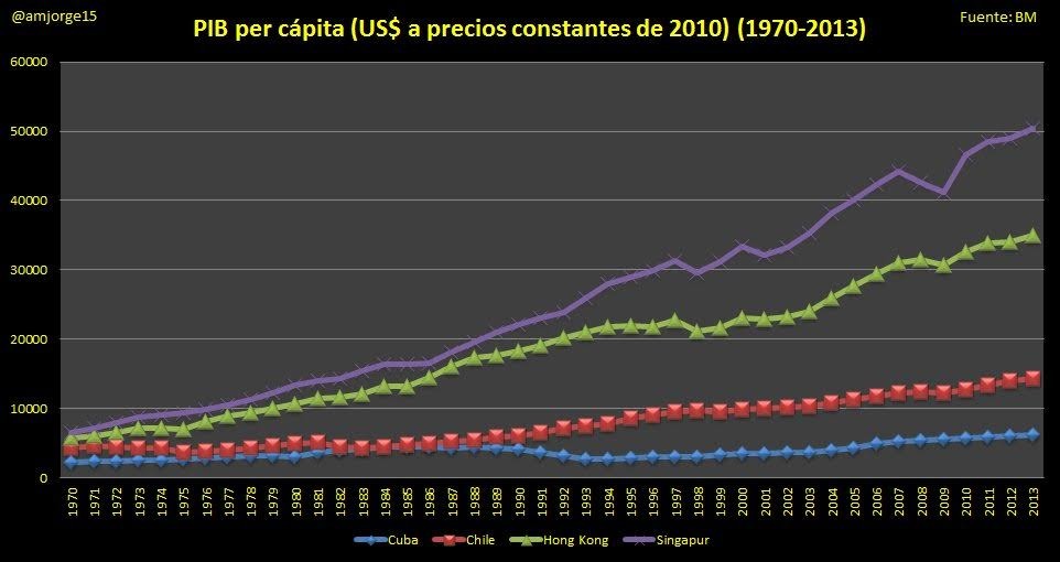 En concreto, la tabla incluye Singapur, Hong Kong y Chile -el país más libre de América Latina. Todos ellos comenzaron la década de 1970 en el rango de los 10.000 dólares de renta per cápita (a precios constantes, pero hoy, mientras que Cuba todavía se mantiene muy por debajo de ese nivel, el resto ha conseguido superar esa cantidad con mayor o menor holgura: Singapur se sitúa en 2013 por encima de los 50.000 dólares per cápita, Hong Kong ronda los 35.000, y los 14.000 dólares de Chile duplican la renta media cubana.