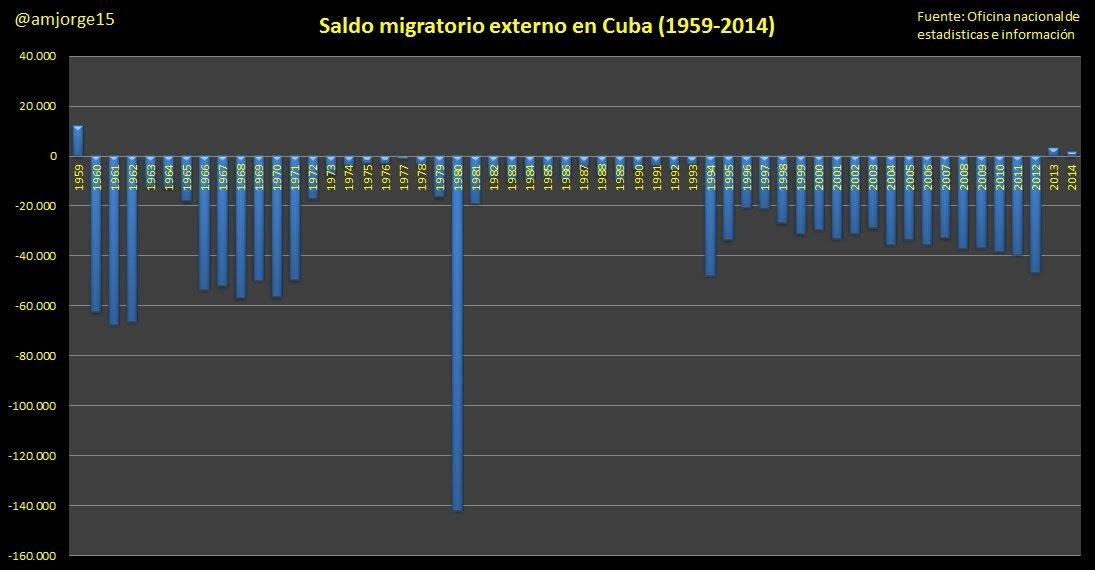 Aunque es evidente que el castrismo no ha cosechado un gran éxito económico en las últimas décadas, cabe argumentar que el PIB per cápita no refleja del todo la realidad social, con que cabría buscar algún otro indicador para complementarlo. A este fin sirve el dato de saldo migratorio exterior que proporciona el propio Gobierno cubano, donde se muestra que desde su llegada al poder, en el año 1959, el régimen cubano únicamente ha tenido tres años con saldo migratorio positivo: el año de inicio del régimen en 1959 y los dos últimos de la serie, 2013 y 2014.
