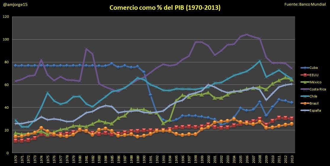 Considerando estos datos, algunos de los defensores del régimen cubano podría acabar reconociendo esta debacle, pero recurriendo al manido argumento del supuesto bloqueo comercial de EEUU para tratar de justificar su origen. La realidad, sin embargo, es bien distinta. Acudiendo de nuevo al Banco Mundial, podemos ver que, lejos de existir un bloqueo que impide comerciar a la isla caribeña entre 1970-1990, el peso de la suma de sus importaciones y exportaciones sobre su PIB era ampliamente superior a la mayoría de sus vecinos tanto del sur como del norte, incluido EEUU.