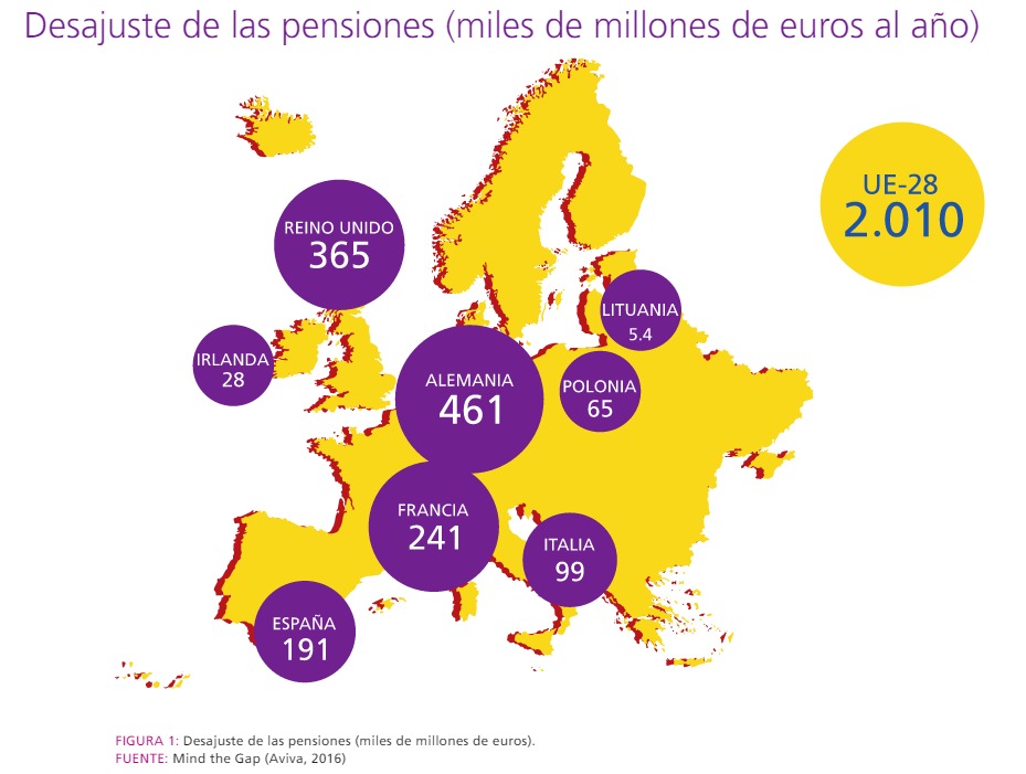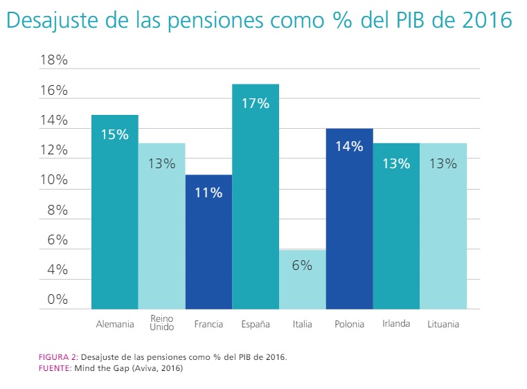 Este jueves, el Instituto Aviva (dependiente de una de las compañías de seguros líder en Europa) presentaba su II Estudio sobre el cálculo del desajuste en las pensiones en Europa. Lo que han tratado de hacer los autores es calcular a cuánto ascenderá ese 70% del salario de los nuevos jubilados entre 2017 y 2057 y cuánto de ese dinero está cubierto por las pensiones públicas. La diferencia es lo que llaman el "desajuste" de las pensiones. Por decirlo de otra manera, el dinero que los europeos tendrán que ahorrar para mantener el nivel de vida cuando se jubilen.