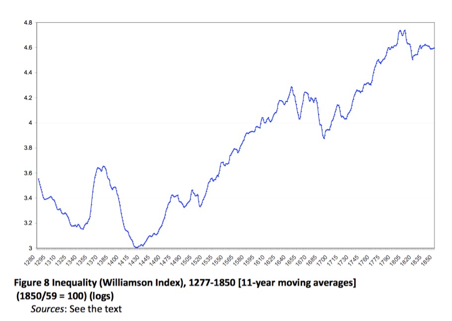 ¿Y qué hay de la desigualdad? Leandro Prados ha estudiado su evolución para el periodo comprendido entre 1277 y 1850. Esta serie larga apunta a un progresivo aumento de las diferencias de ingresos, generado a partir de la conquista de América, en 1492. Las nuevas oportunidades económicas no se extendían, por tanto, de manera generalizada, sino que generaban una España con distintos umbrales de progreso. Esta estructura ni siquiera fue a menos conforme el Imperio fue perdiendo en importancia, de manera que el coeficiente de Williamson, que mide las diferencias de ingresos, pasó de 3,4 a finales del siglo XV a 4,6 a comienzos del siglo XIX.