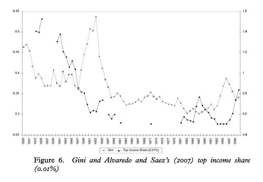 Si medimos únicamente los ingresos que controla el 0,01% más rico, vemos que su peso se ha ido reduciendo con los años. Si las élites económicas manejaban en los años 30 alrededor del 1,5% del PIB, en 1999 controlaban un 0,8%, es decir, la mitad.