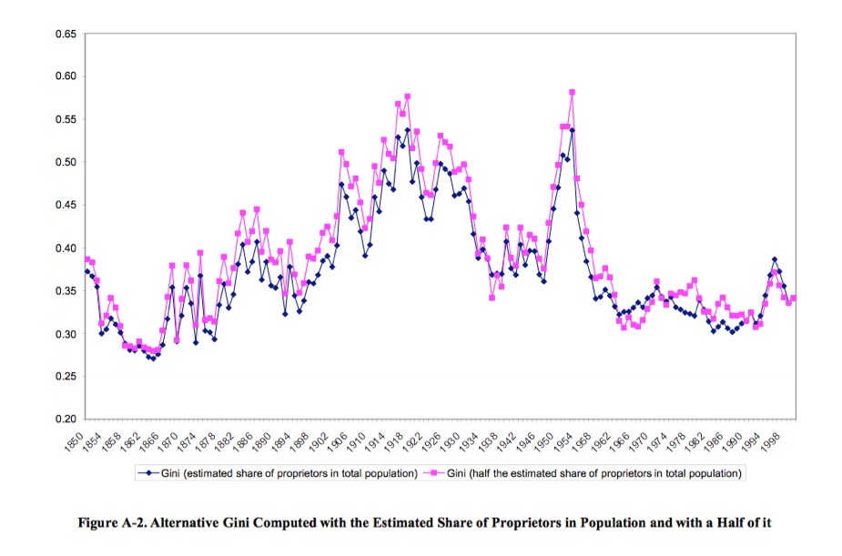 La lenta industrialización de España en el siglo XIX también fue de la mano con niveles más altos de desigualdad, aunque la incidencia de la I Guerra Mundial y, sobre todo, de la Guerra Civil, generó una caída de las diferencias de ingresos, si bien no hablamos de fenómenos que trajeron clases medias más anchas sino de momentos históricos marcados por un repunte de la igualdad en la pobreza. Sin embargo, desde la apertura de la economía española en 1959, la senda que ha seguido el coeficiente Gini de desigualdad de ingresos ha sido decreciente.