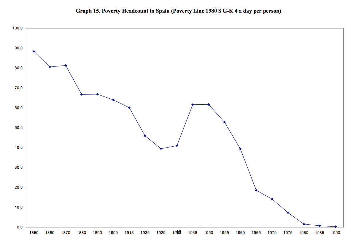 Quizá el primer debate que podemos abordar con datos de Leandro Prados es el de la pobreza. Entre mediados del siglo XIX y la segunda mitad del siglo XX, su incidencia en España pasó del 90% registrado en 1850 al 60% de 1950. Desde entonces, se produjo un descenso más acelerado de la tasa de pobreza, que cayó al 40% en 1960, al 20% en 1970 y a niveles inferiores al 5% en los años 80, haciendo de España un país desarrollado.
