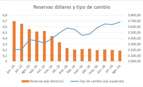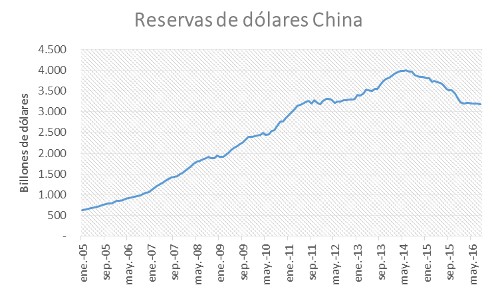 Sin embargo, ante un shock de cierta magnitud, las autoridades chinas no están dispuestas a dejar flotar completamente su moneda, tal y como sucedió a mediados de 2008 (se reestableció un tipo de cambio fijo durante dos años). Actualmente, el Banco Popular de China (banco central) ha salido a defender su moneda para evitar que la sobreventa moviera demasiado el tipo de cambio. Para hacerlo se ve obligado a recomprar su moneda y vender los dólares en reserva. Así vemos cómo las reservas de dólares se han ido agotando.