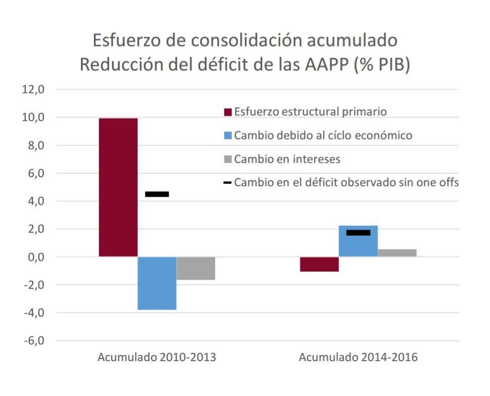 Y es que, dentro del proceso de consolidación fiscal se distinguen dos etapas: la primera, desde 2010 a 2013, en donde las medidas para reducir el déficit fueron considerables; y una segunda, los dos últimos años, donde dicho esfuerzo ha sido mucho más tenue, ya que el Gobierno se limitó a esperar que la reducción del déficit se produjese de forma automática gracias a la recuperación económica y el actual contexto de bajos tipos de interés.