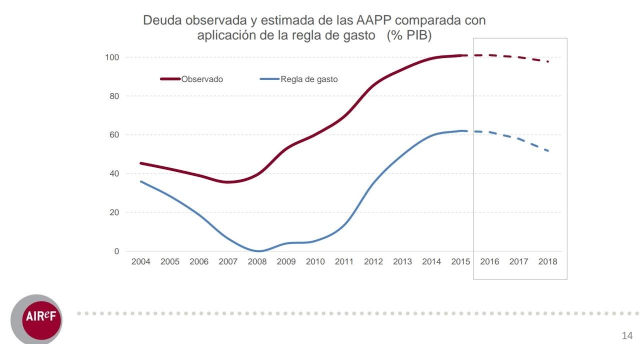 Además, según las estimaciones de la AIReF, de haberse aplicado la Regla de Gasto con anterioridad durante los años de la burbuja inmobiliaria, período en el que se disparó el gasto público, este incremento se habría visto considerablemente limitado, con lo que también el nivel de deuda publica sería hoy considerablemente inferior al actual, próximo al 60% del PIB.