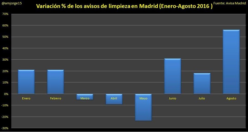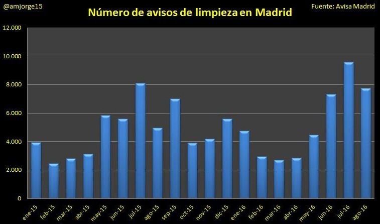 Uno de los principales debates en el que los partidos políticos se enfrentan en Madrid es la limpieza de la ciudad. A ese respecto, son muy empleadas las cifras de avisos de limpieza que se canalizan a través del servicio de Línea Madrid. El número de avisos acumula un aumento del 16% interanual en los ocho primeros meses del año. Destaca el repunte registrado en julio, con un total de 9.571 quejas por parte de los vecinos (+16%), pero, sobre todo, el de agosto, con un incremento del 56% interanual.