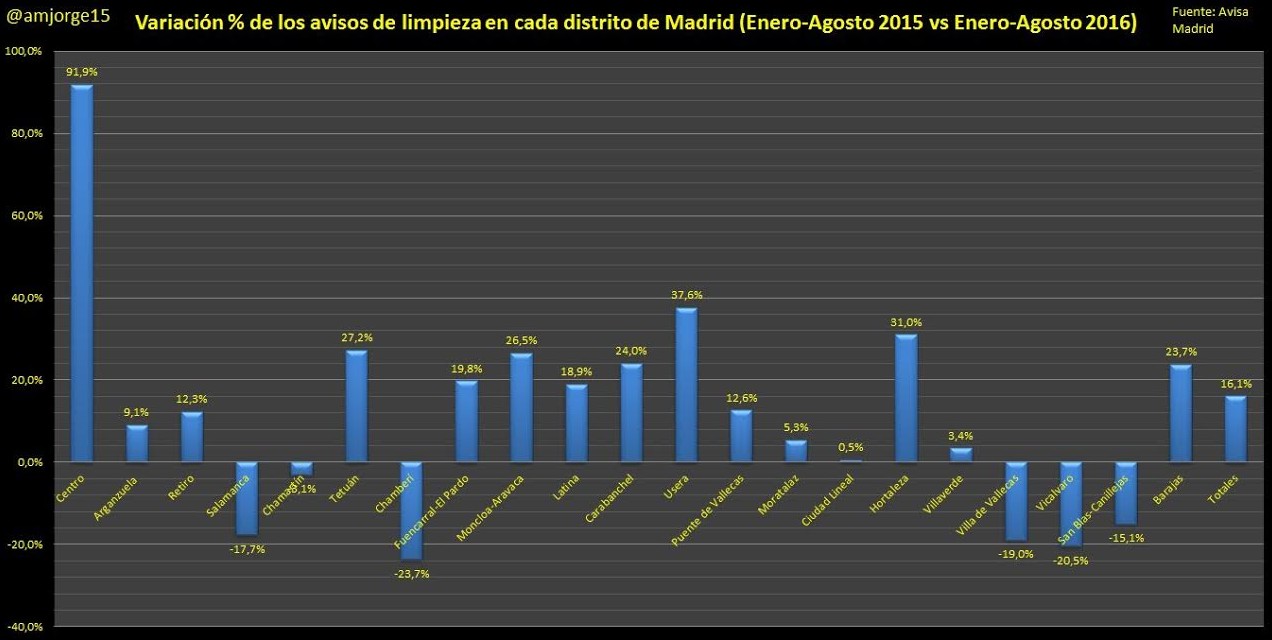 Sin embargo, llama especialmente la atención el aumento de solicitudes de limpieza que experimenta el distrito Centro, el más turístico de Madrid, al pasar de 3.400 entre enero y agosto de 2015 a más de 6.500 en el mismo período de 2016 , casi el doble. Cabe recordar que este barrio es uno de los más visitados y visibles de la ciudad, y, por tanto, su aspecto y condiciones tienen un efecto especialmente importante en el turismo de la capital, para bien o para mal, con lo que es complejo pensar en un sitio peor para que se produzca este vertiginoso incremento.