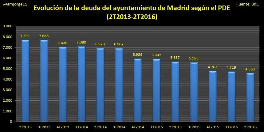 El pasado jueves la publicación por parte del Banco de España de los datos de deuda pública (PDE) suscitó un amplio debate sobre la actuación de las diferentes administraciones tanto a nivel nacional como autonómico y local. Ahora Madrid aprovechó la ocasión para destacar que la deuda municipal ha bajado en más de 1.000 millones en su primer año de gobierno, desde junio de 2015 hasta el mismo mes de 2016.