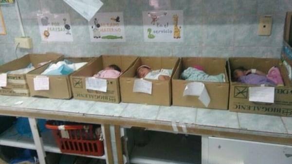 La oposición venezolana distribuyó el jueves unas imágenes que reflejan el dramático estado de los hospitales venezolanos. La Mesa de la Unidad Democrática compartió con la cadena de noticias CNN En Español éstas imágenes de bebés recién nacidos acostados en cajas de cartón en el Hospital Domingo Guzmán Lander en Barcelona, estado de Anzoátegui, organismo dependiente del Instituto Venezolano de los Seguros Sociales.