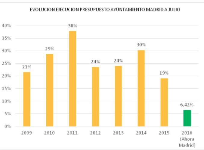 En el caso de Ahora Madrid, se amortiza por "ineficacia" y no por "eficacia". Hay muchos ejemplos de gasto social e inversiones municipales que están inicialmente en los presupuestos, pero luego no llegan a ejecutarse por falta de capacidad del autoproclamado "Ayuntamiento del cambio, de la ilusión, del sí se puede".