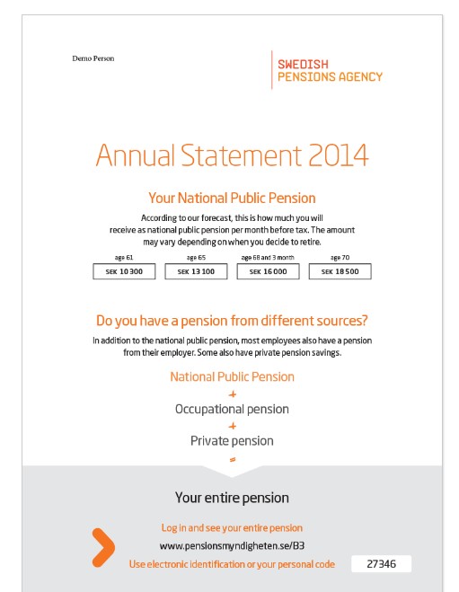 trabajadores podrían tomar mejores decisiones sobre su futuro. En lo que respecta a las pensiones, sabrían cuánto iban a cobrar una vez llegada su jubilación y cuánto necesitarían ahorrar para mantener su actual nivel de vida. España no sería el primer país que toma esta iniciativa. El ejemplo clásico para este tema es Suecia, que manda cada año un sobre naranja que incluye esta información (algo muy necesario en un país con cuentas nocionales).