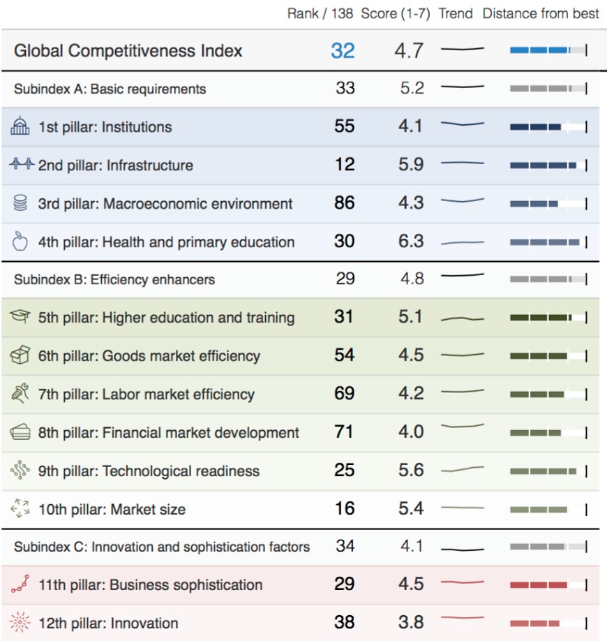Si desagregamos la nota de España según las diferentes categorías del estudio, comprobamos con claridad cuáles son los pilares que funcionan mejor y peor en nuestra economía. Alcanzamos el puesto 55 en instituciones, el 12 en infraestructuras, el 86 en entorno macroeconómico, el 30 en sanidad y educación, el 31 en formación superior, el 54 en eficiencia del mercado de productos, el 69 en ámbito laboral, el 71 en sector financiero, el 25 en preparación tecnológica, el 16 en tamaño del mercado, el 29 en sofisticación empresarial y el 38 en innovación.