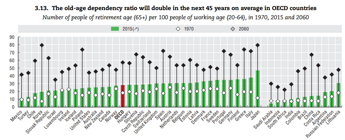 Cuidado con este gráfico, porque puede llevar a engaño. Muestra el porcentaje de personas de más de 65 años respecto a la población en edad de trabajar. España aparece a mitad de la tabla, entre Austria y Reino Unido. Pero eso es porque los países están ordenados según la ratio de dependencia en 2015. Si miramos la fila de rombos negros (ratio de dependencia previsto en 2060) todo cambia. Si nada cambia, en unas décadas España estará entre los 4-5 países con una población más envejecida del mundo.