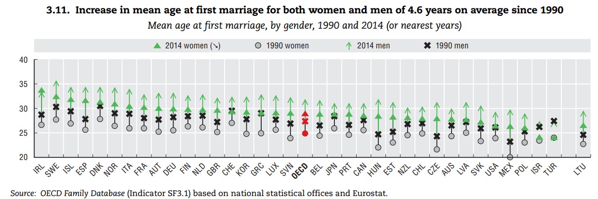 Otro fragmento de la misma imagen. También sube la edad a la que nos casamos. Aquí puede haber causas diferentes: por ejemplo, un cambio en las costumbres sociales y el aumento de parejas de hecho o de personas que conviven con la pareja sin ningún tipo de acuerdo legal. Por ejemplo, algo de esto se intuye en los países nórdicos, que sin tener unas tasas de fertilidad disparadas, sí que están por encima de la media de los países ricos, aunque tienen pocos matrimonios. En el caso de España, sin embargo, parece que el incremento en la edad a la que nos casamos (hombres y mujeres) tiene un poco de todo (cambio social y tendencia demográfica).
