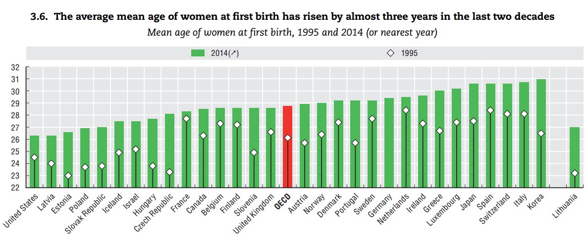 Tampoco puedes tener muchos hijos si te pones a la tarea con 34-36-38 años. Y lo que antes era la excepción, ahora era la norma. La edad media de las españolas cuando tienen su primer hijo ya supera los 30 años. Sólo suizas, italianas y coreanas presentan una media superior.