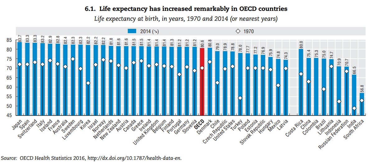 El primer gráfico es el único que no debería preocuparnos. De hecho, es un reflejo de nuestro mayor éxito. España es el segundo país del mundo en esperanza de vida tras Japón. Hay muchas razones: clima, alimentación, sistema sanitario… Pero la realidad es que cuando lo miramos, todos pensamos en qué implicaciones económicas tendrá esta buena noticia. Desgraciadamente, esta cara de la moneda no es tan positiva.