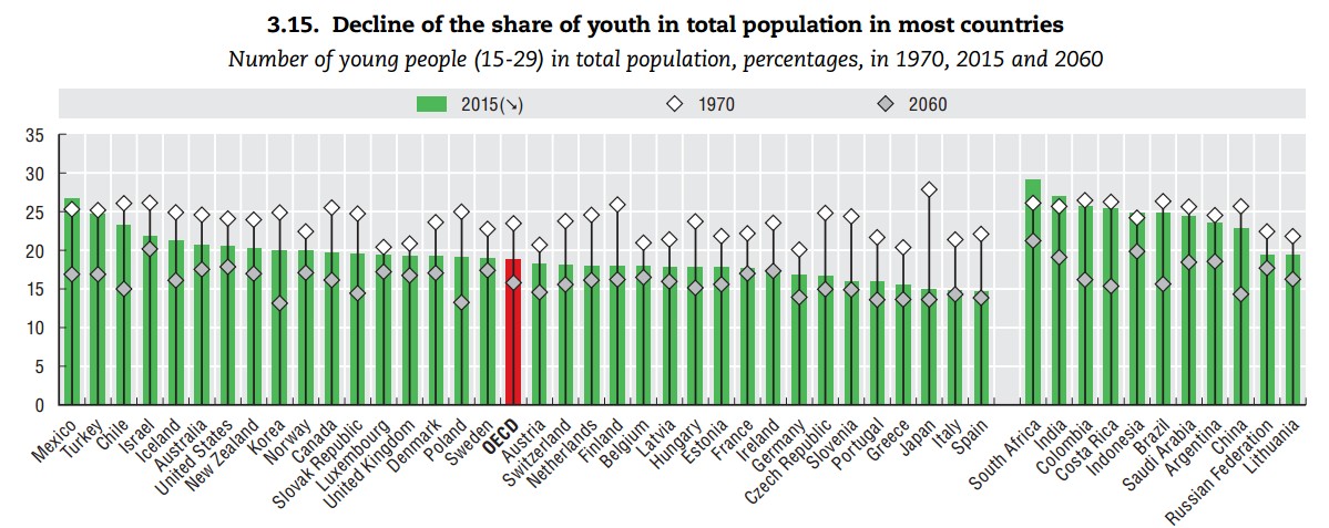 La razón de esas malas perspectivas para 2060 hay que buscarla en este tercer gráfico, que muestra el porcentaje de población joven (15-29 años) respecto a la población total. Pues bien, en 2015 España era el país con una cifra más baja del mundo (en la tabla sólo aparecen los miembros de la OCDE). No era así en 1970, pero sí seguirá siendo así en 2060 si no hay cambios inesperados. Ni tenemos jóvenes, ni los tendremos.