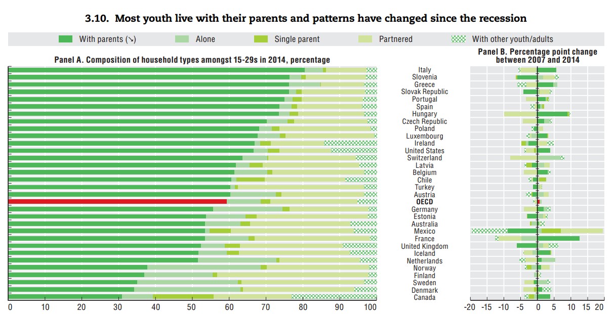 La semana pasada, la OCDE publicaba su estudio Society at a glance 2016. El informe es muy completo, con indicadores de salud, igualdad, ingresos, cohesión social… Este año se centra en los jóvenes. Por eso, la mayoría de los artículos publicados en España destacaban el elevado porcentaje de ninis que hay en nuestro país, el cuarto del mundo con más jóvenes que ni estudian ni trabajan.