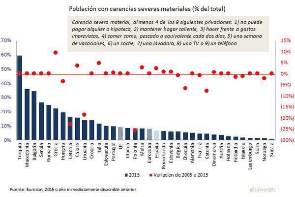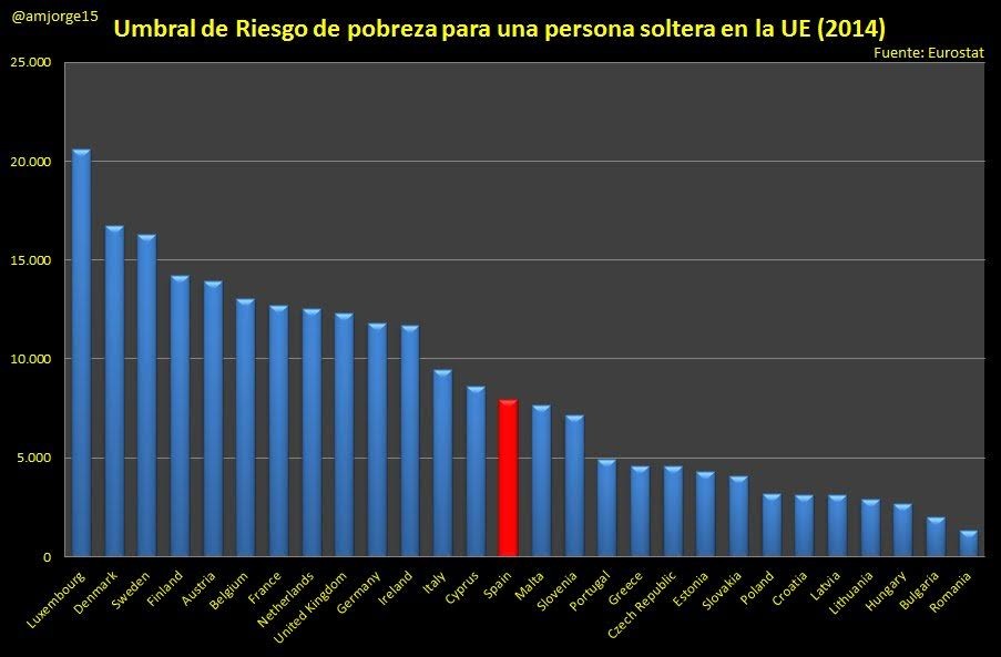 Conociendo la composición de este dato, es del todo disparatado usarlo para hablar de pobreza laboral, ya que engloba, entre otros, a muchas personas que carecen de empleo. Además, para llevar a cabo el cálculo del riesgo de pobreza se toma como umbral el 60% de la renta mediana de cada país, con lo que es evidente que este indicador dista mucho de reflejar la pobreza material, pues incluso en países donde ésta es residual, como Luxemburgo, donde la carencia material severa se sitúa en un 2% de la población, el riesgo de pobreza se sitúa en un 15% y la tasa de riesgo de pobreza o exclusión en un 18,5%.