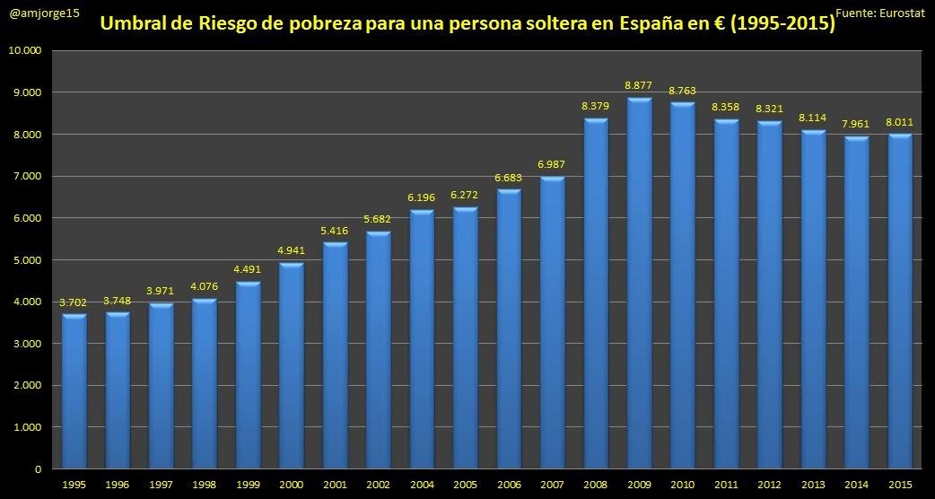 De hecho, el umbral de renta por debajo del cual se considera que alguien está en situación de riesgo de pobreza en España ha variado con el tiempo: en 1995, era de 3.700 euros al año, mientras que en 2009 fueron 8.877 y 8.011 en 2015 (estos datos se calculan a partir de los datos de renta del año anterior a la entrevista).
