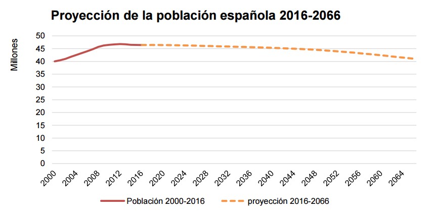La proyección demográfica del INE publicada este jueves pinta un panorama muy negro a los futuros pensionistas. Así, la población del país aumentaría levemente en 2016 para luego iniciar un descenso ininterrumpido a partir de 2017. En concreto, en los 15 próximos años, España perdería 552.245 habitantes (un 1,2%), lo que situaría su población en 45,9 millones de personas en 2031, y dentro de 50 años el descenso sería de más de 5,3 millones de habitantes (un 11,6%), de modo que la población total se reduciría a 41,1 millones en 2066. Y ello, contando los posibles flujos migratorios que puedan producirse.