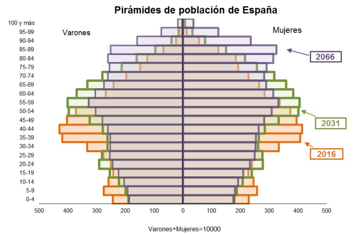 De este modo, la pirámide poblacional pasará a tener una forma invertida en los próximos años (más población en la cúspide que en la base). Como consecuencia, el grupo quinquenal más numeroso, que en la actualidad se sitúa entre 40 y 44 años, sería el de 55 a 59 años tanto en 2031 como en 2066. Es decir, la edad media de los españoles aumentará o, lo que es lo mismo, la población envejecerá de forma muy sustancial en las próximas décadas.