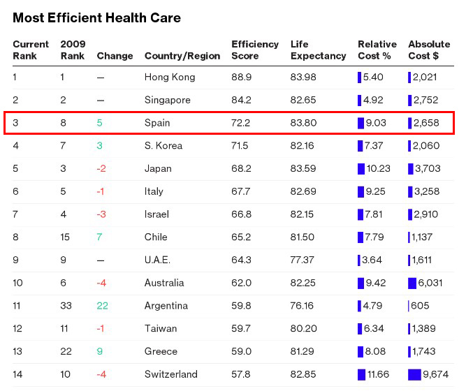 - Lo apuntado en el anterior párrafo tiene como consecuencia que hay países con un gasto sanitario muy elevado (EEUU es el ejemplo clásico, pero no el único) con malos datos de salud pública y otros con un gasto mucho más reducido (España, pero también Italia o Singapur) que tienen cifras generales mucho mejores. Pretender hacer generalizaciones con estos datos puede generar muchos equívocos. Por eso, índices como el de Bloomberg tienen una importancia relativa. En este caso, lo llamativo no es tanto lo que dicen los datos, como el silencio de una prensa tan presta a publicar cualquier otra cifra que vaya en una dirección diferente.