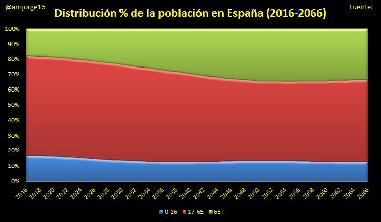 El aumento del gasto es inevitable por cuestiones demográficas. Según la últimas proyecciones del Instituto Nacional de Estadística (INE), el porcentaje de población mayor de 65 años va a pasar de representar un 17,7% de la población total a un 33,4% en la próximas décadas. Este incremento es a costa tanto de los más jóvenes, el grupo de 0-16 años pasará del 17% al 13%, como de la población en edad de trabajar (17-65), que caerá del 65% en 2016 al 53,6% en 2066.
