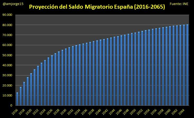 Sin embargo, las proyecciones del INE ya tienen en cuenta el factor inmigración, pues incluyen un saldo migratorio positivo y creciente a partir de 2016, pasando de una diferencia positiva de 12.000 personas el presente año a 80.000 en 2065. En total, el saldo migratorio acumulado en ese periodo ascendería a un total de 3 millones de personas.