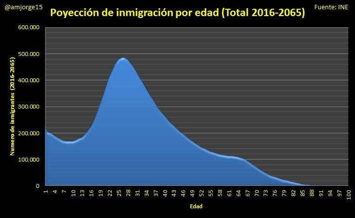 Si nos fijamos únicamente en la inmigración, el INE pronostica que España recibirá algo más de 17 millones de inmigrantes en los próximos 50 años, casi el 75% personas en edad de trabajar (entre 17-65 años), mientras que el grupo de edad que engloba a los mayores de 65 años tan solo representaría un 5%.
