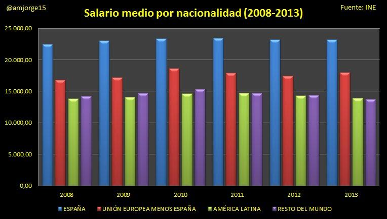 Por último, hay que aclarar que un trabajador inmigrante no podría sustituir las cotizaciones que aporta un trabajador de nacionalidad española, máxime si éste está en sus últimos años de trabajo, cuando el salario es habitualmente mucho mayor. Esto se debe a la brecha salarial que existe entre trabajadores de diferente nacionalidad, debido a que, en general, disponen de una menor cualificación laboral, y todo apunta a que esta diferencia se mantendrá en el tiempo, siempre y cuando se mantenga la actual estructura productiva. Así mientras que un trabajador de nacionalidad española percibe un salario medio de más de 23.000 euros al año, los inmigrantes de la UE cobran de media unos 18.000 euros y los procedentes de Latinoamérica unos 14.000 -con dato de 2013-.