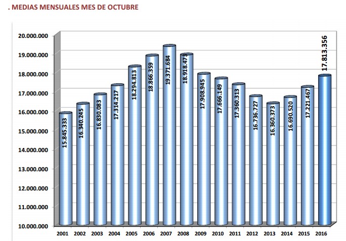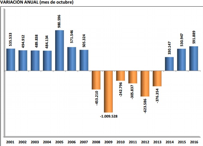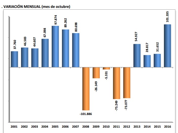 Octubre suele ser un mes favorable en materia de empleo debido, sobre todo, al inicio del curso académico, pero este año ha sido especialmente positivo, ya que se trata del mayor aumento registrado en este mes de toda la serie histórica El año pasado, por ejemplo, el sistema ganó en octubre 31.652 afiliados, tres veces menos que este ejercicio.