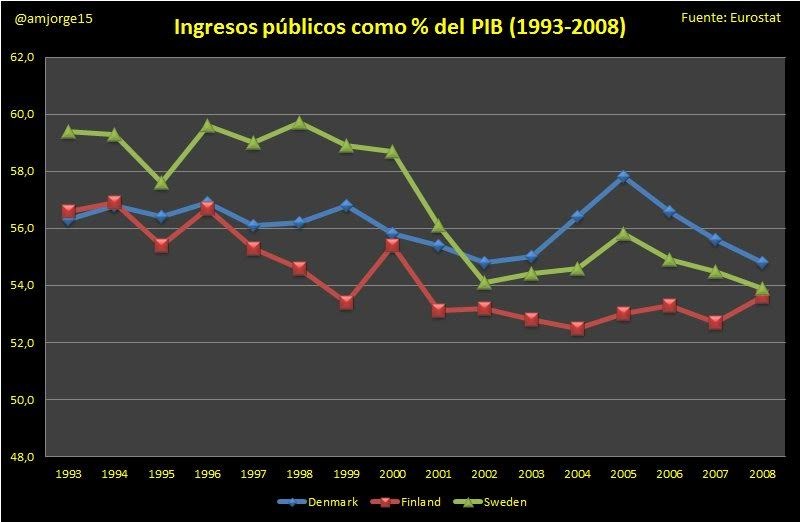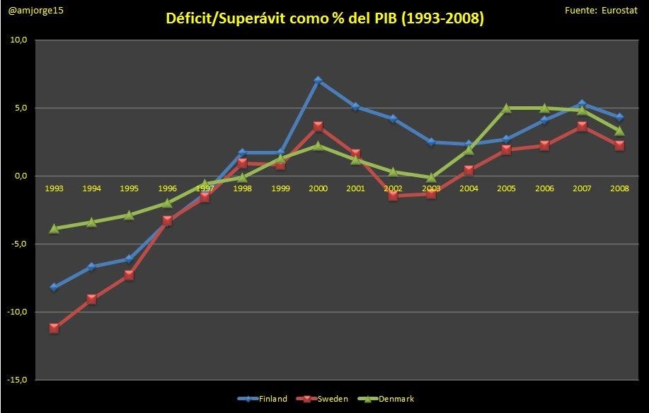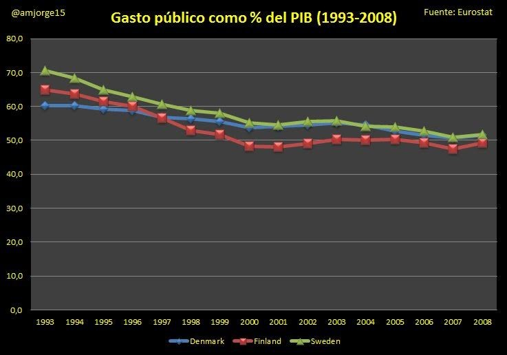 A la cabeza del gasto público estaba Suecia, con un 70% de su PIB en 1993, en segundo lugar Finlandia con un 64% y, por último, Dinamarca con un 60%. Las tres economías redujeron el peso del gasto público sobre el PIB, de manera que en el año 2000 el gasto en Suecia era del 55%, en Finlandia del 48% y en Dinamarca del 53,7%. Hasta 2008, esos niveles de gasto se mantuvieron más o menos estables. Ese sustancial recorte del gasto permitió reducir el déficit, de modo que en el año 2000 ya habían abandonado los números rojos y registraban abultados superávits de hasta el 7% del PIB