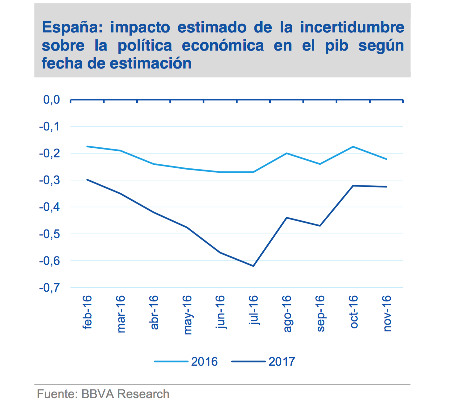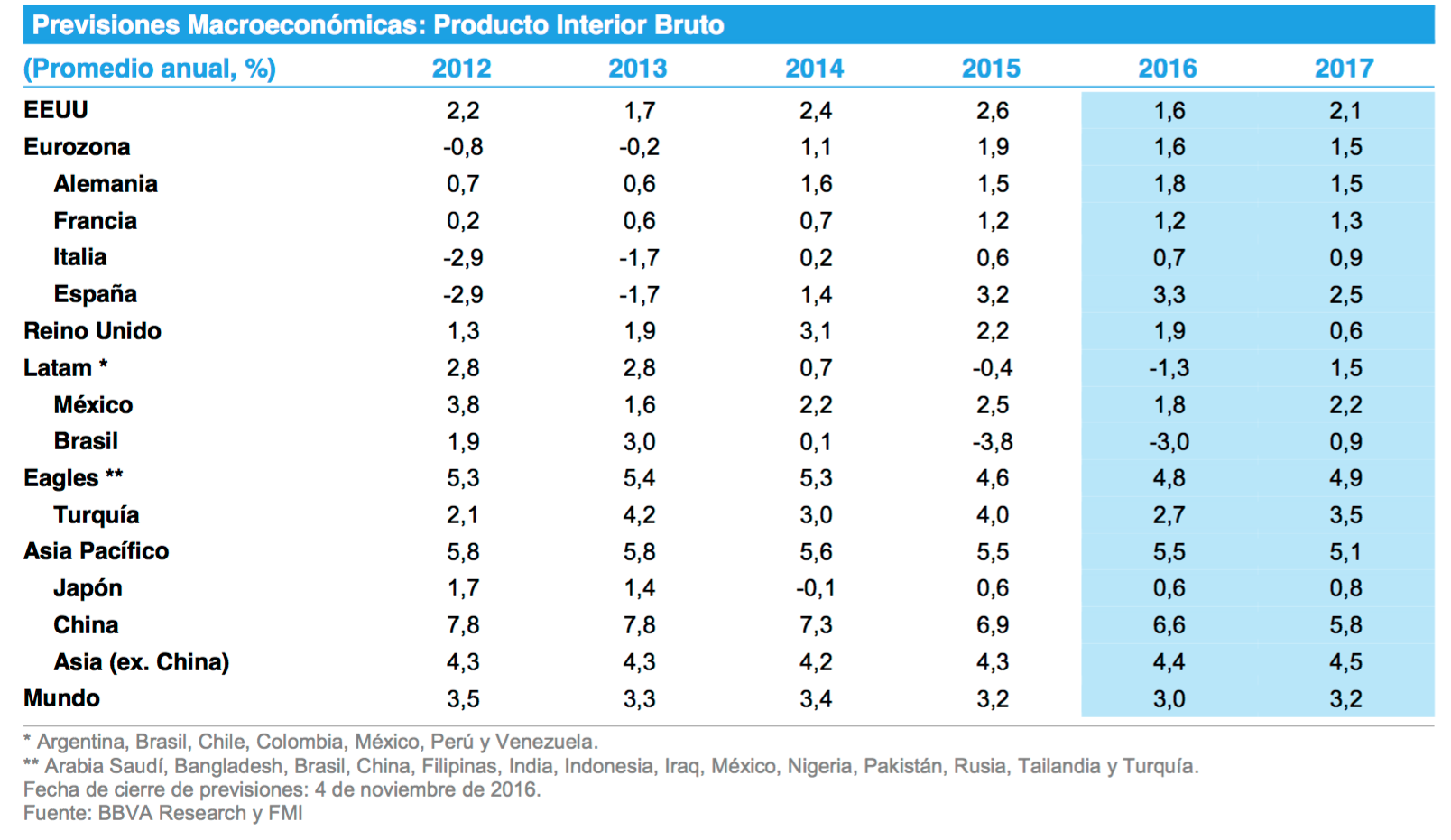 BBVA Research espera que 2016 acabe con un aumento del PIB del 3,3%, pero apunta que en 2017 caeremos a un ritmo más moderado de crecimiento, en niveles del 2,5%. "Para reducir esa vulnerabilidad, será fundamental la disminución de la incertidumbre sobre la política económica y la implementación de medidas ambiciosas para aumentar el crecimiento", señala el documento.